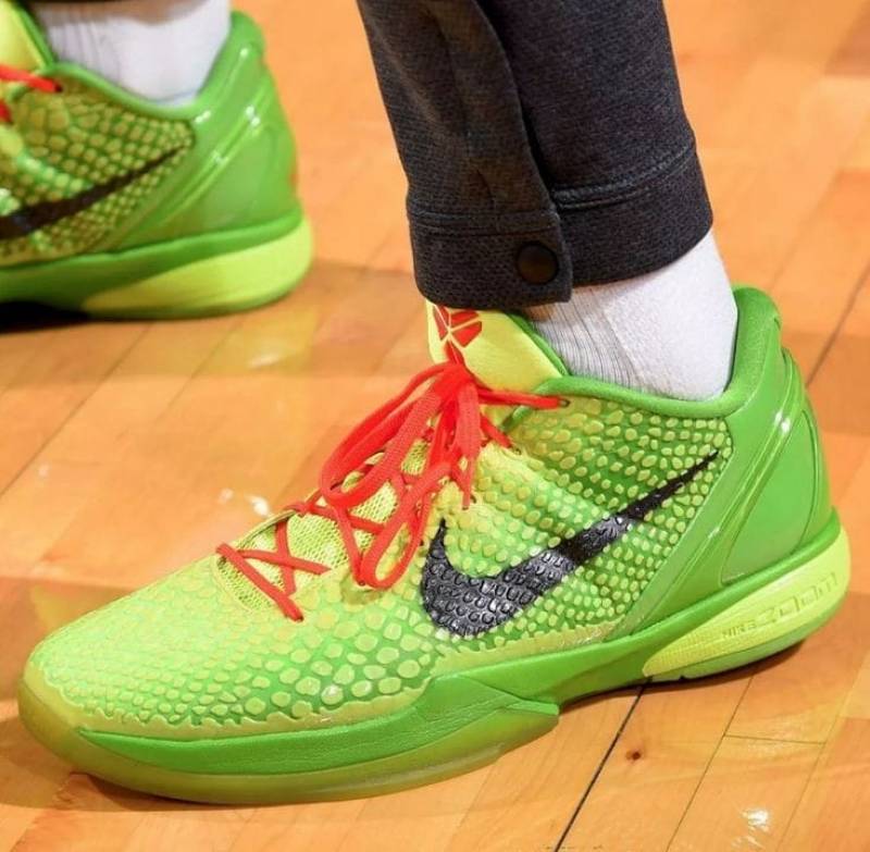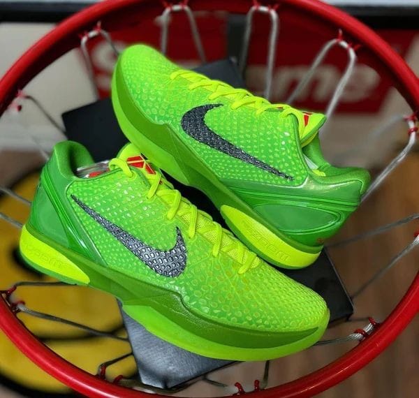 Turn heads on and off the court with the NK Kobe 6 Protro “Grinch”, a stunning high-quality sneaker inspired by the legendary Black Mamba. Crafted with a vibrant neon green upper, textured reptile-like design, and signature Kobe logo in crimson, this shoe isn’t just a style statement—it’s a tribute to greatness.